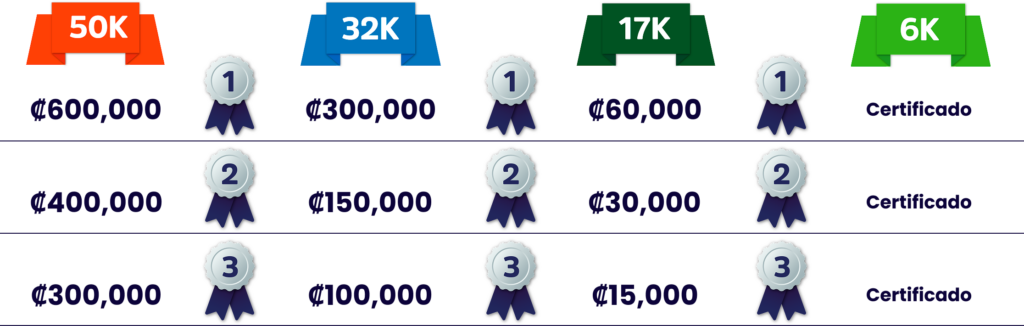 Se premiarán al primer, segundo y tercer lugar de cada distancia en 2 categorías, femenino y masculino, de la siguiente manera: